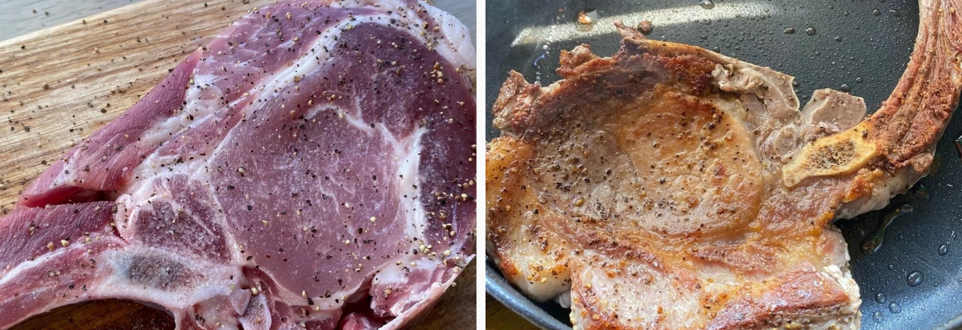 1大匙橄欖油,熱油鍋,將巧克力戰斧豬梅花兩面,各煎約3分鐘至上色。