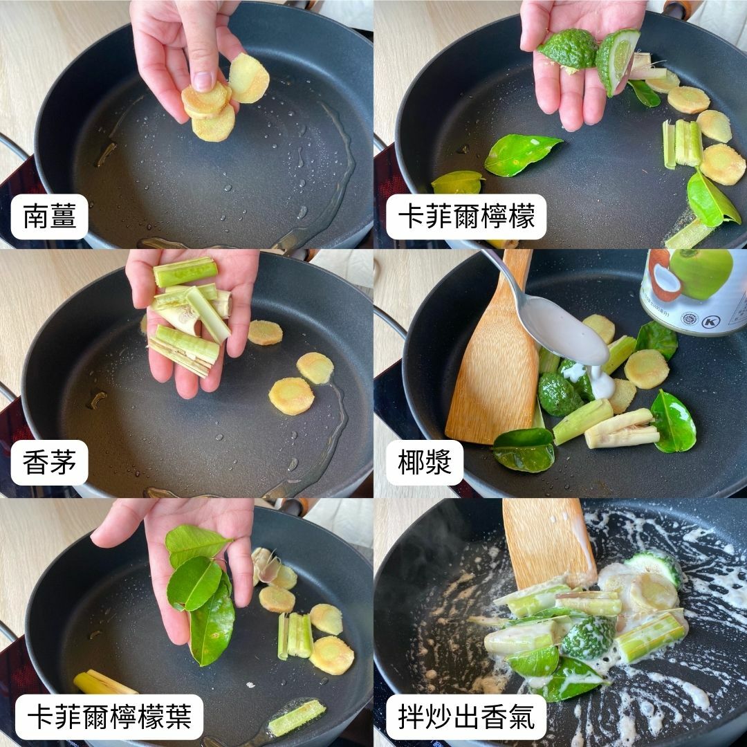 熱油鍋,放入南薑片、香茅、卡菲爾檸檬葉、卡菲爾檸檬一起拌炒再加入些許椰奶炒出香味。