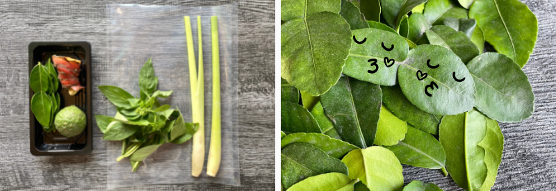 內含東南亞料理常見的辛香料,南薑、卡菲爾爾檸檬、卡菲爾爾檸檬葉、九層塔、香茅。