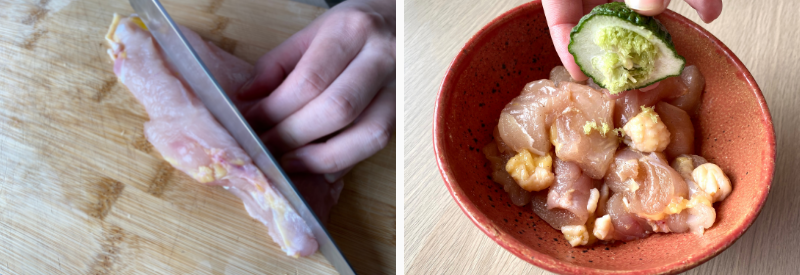 將竹地雞胸肉切成塊狀後並用調味料和卡菲爾檸檬汁抓醃。
