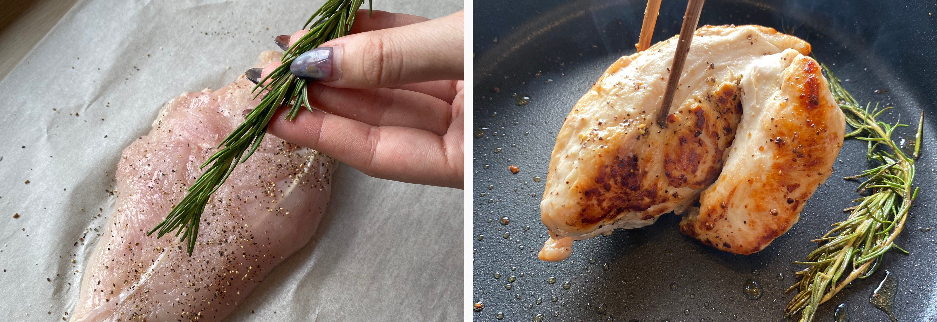 竹地雞胸加入迷迭香與黑胡椒、鹽巴調味。