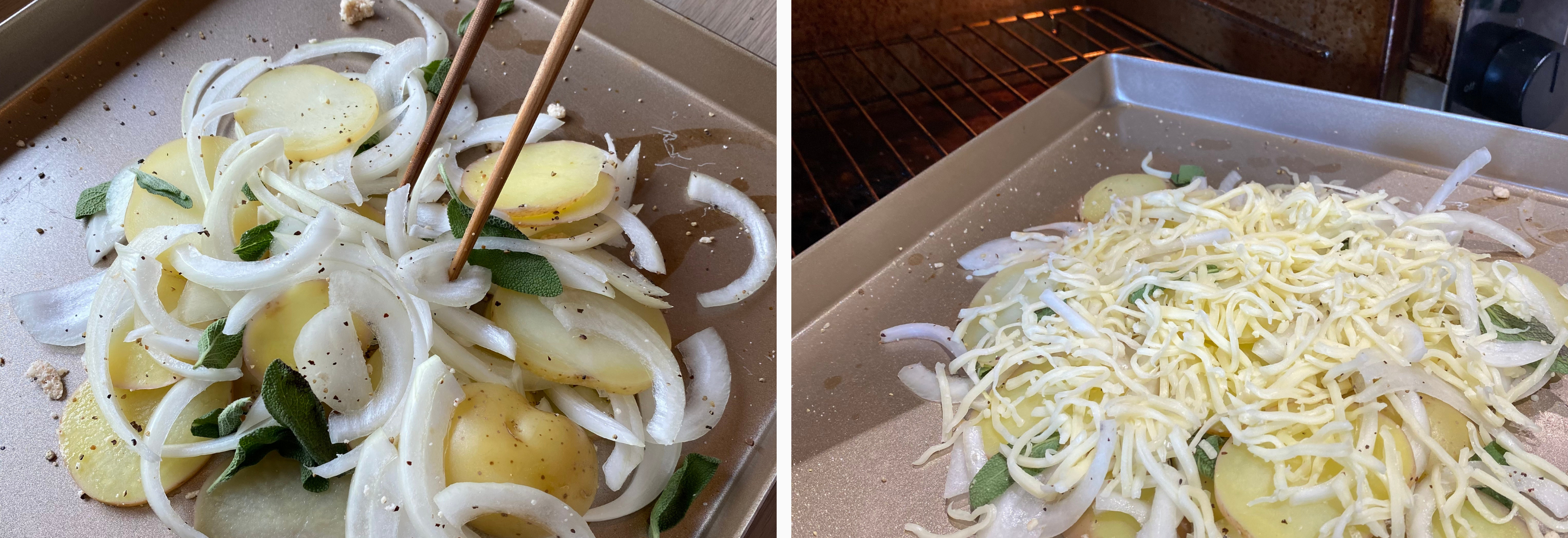 將彩色馬鈴薯放上烤盤裡,鋪上洋蔥、適量鹽巴、黑胡椒粒、雞高湯塊捏碎、些許鼠尾草。均勻鋪上乳酪絲,預熱烤箱上、下火200度,放進去烤15分鐘。