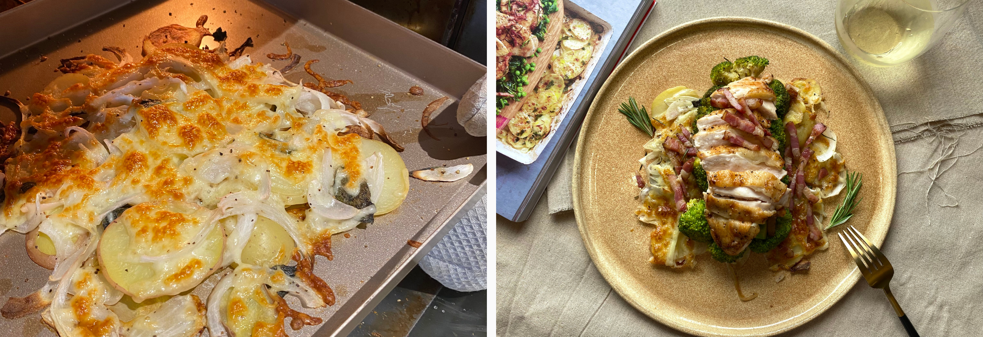餐盤上依序放上焗烤馬鈴薯、蔬菜與煎好的雞胸肉即可上桌!