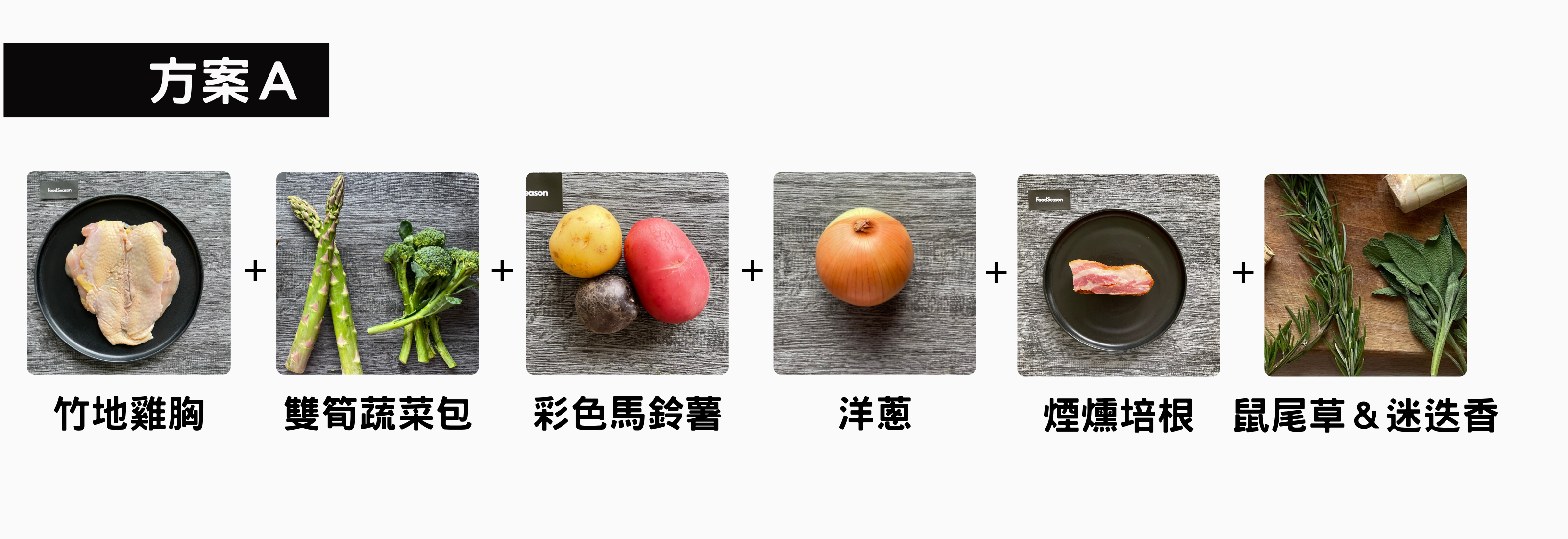 方案A:竹地雞胸1副+雙筍蔬菜包+彩色馬鈴薯3顆+洋蔥1顆+煙燻培根100g+迷迭香30g+鼠尾草30g