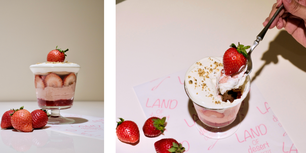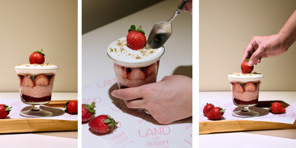 喜歡拍照的女孩們不能錯過這款法式甜點與日式風格融合的季節限定草莓帕妃杯!自製覆盆子果凍與草莓醬在杯底酸甜交織,法國草莓起司餡搭配台灣大湖草莓的自然清甜,讓每一層都充滿濃郁果香。手工特製的Desert原味之谷餅乾與午後伯爵茶餅乾碎,為帕妃杯增添酥脆的口感層次。頂層的香草鮮奶油如雲般輕盈,完美收尾,每一口都充滿驚喜!