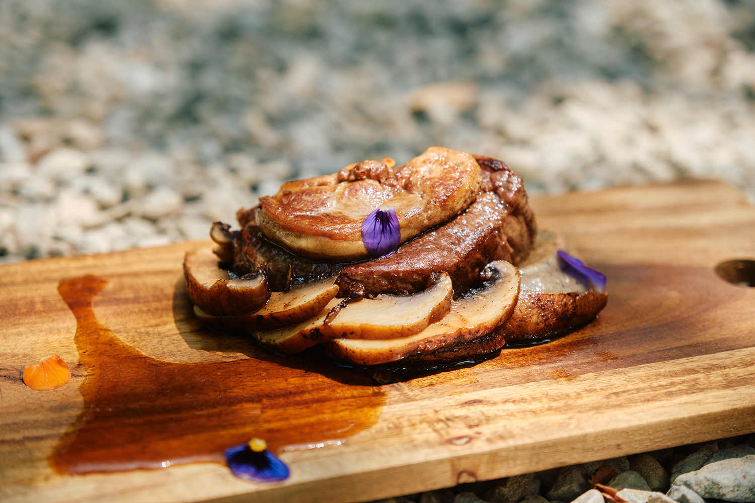 選用紐西蘭草飼牛,深層甜潤鮮嫩的菲力牛排,熱量較低,清爽無負擔。法式香煎鴨肝搭配台灣在地波特菇,配上濃郁的黑松露薯泥淋上牛骨醬汁,點綴色彩繽紛的花瓣,讓您享受最頂級的結合。