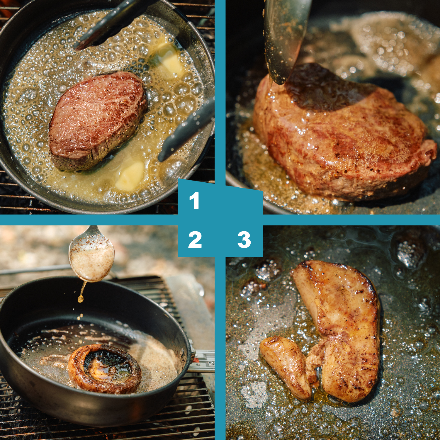 2. 轉中小火,加入奶油至鍋中,用湯匙澆淋奶油在菲力牛表面,增加風味