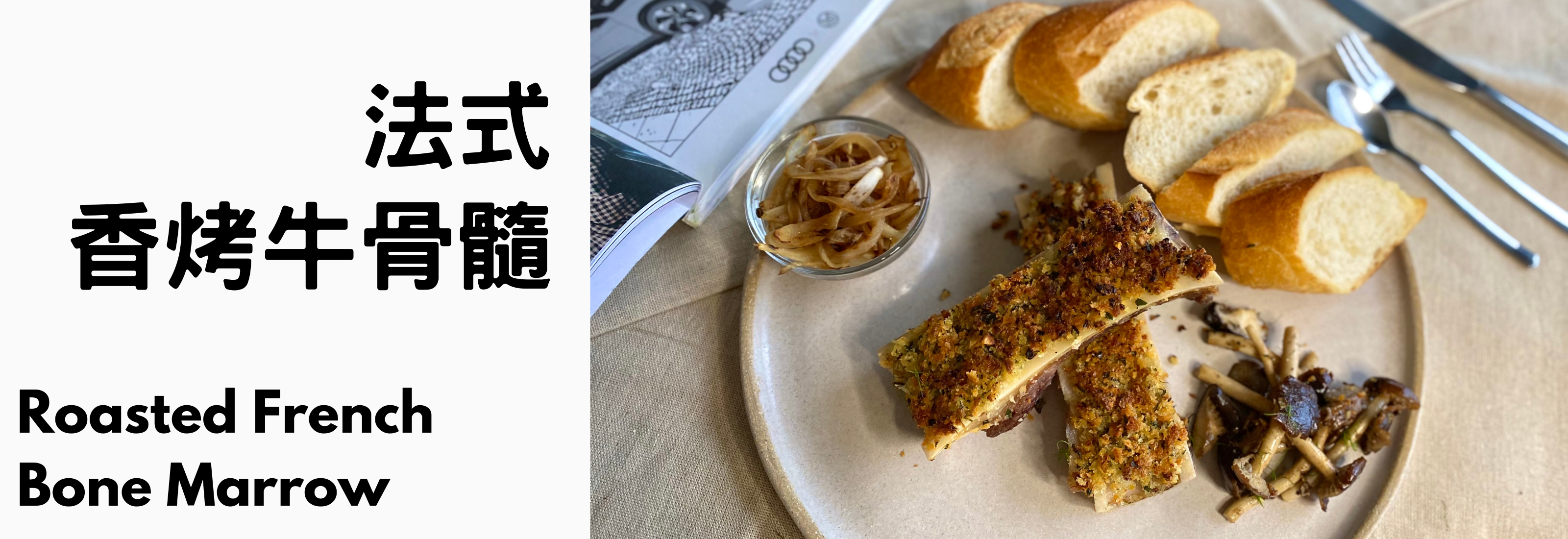 以牛骨髓作為醬料,和法國麵包一起吃,在法國可以說是非常日常的料理。抹醬的製作其實很容易,用香草香料和奶油與麵包糠即可完成,非常適合做為一道儀式感十足的開胃菜。