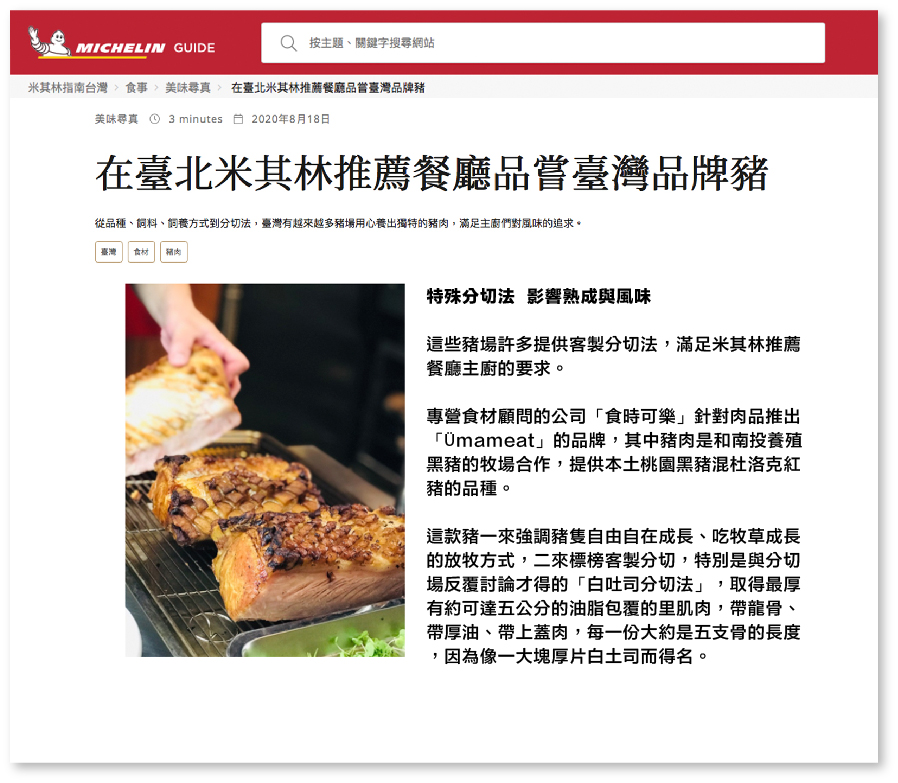 「 Umameat放牧黑豬 」使用專屬開發的白土司分切法,取出一頭豬只有兩顆、位於肋眼後段6-10支骨頭的超精華部位,外表覆蓋著一層如白奶油的雪脂,看起來就像是一整顆剛出爐的白吐司。