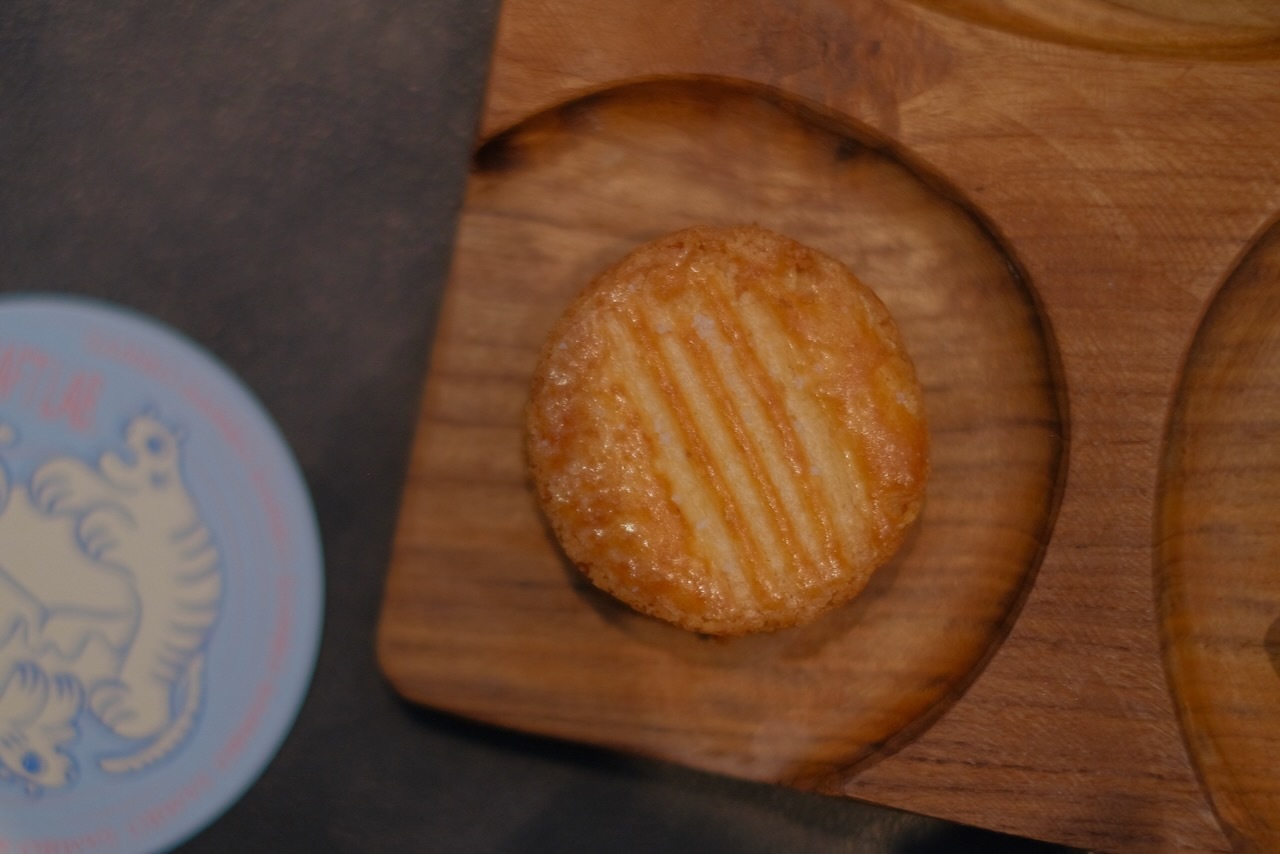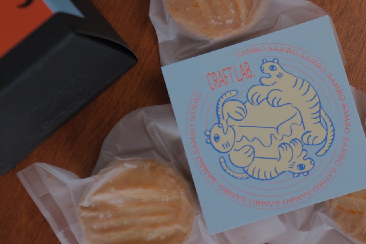 「SAMBO虎紋酥餅」,以童話故事Little Black Sambo四隻老虎變成奶油的故事為發想,與甜點品牌「Desert LAND 綠洲」共同研發的布列塔尼酥餅,餅乾表面劃上一條條紋路呼應虎紋,風味純粹簡單帶奶香、堅果香氣的酥鬆餅乾,適合搭配各種茶飲。